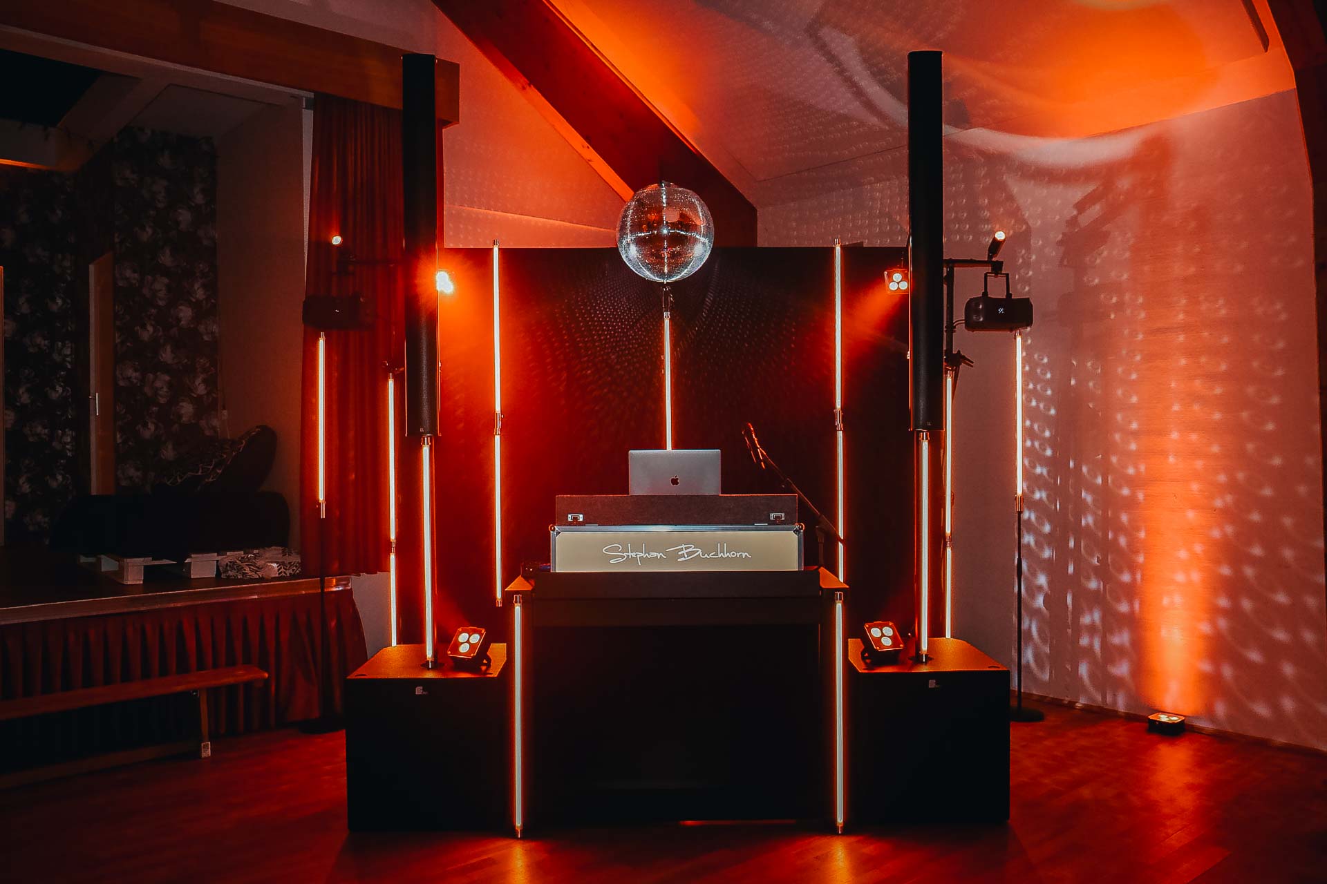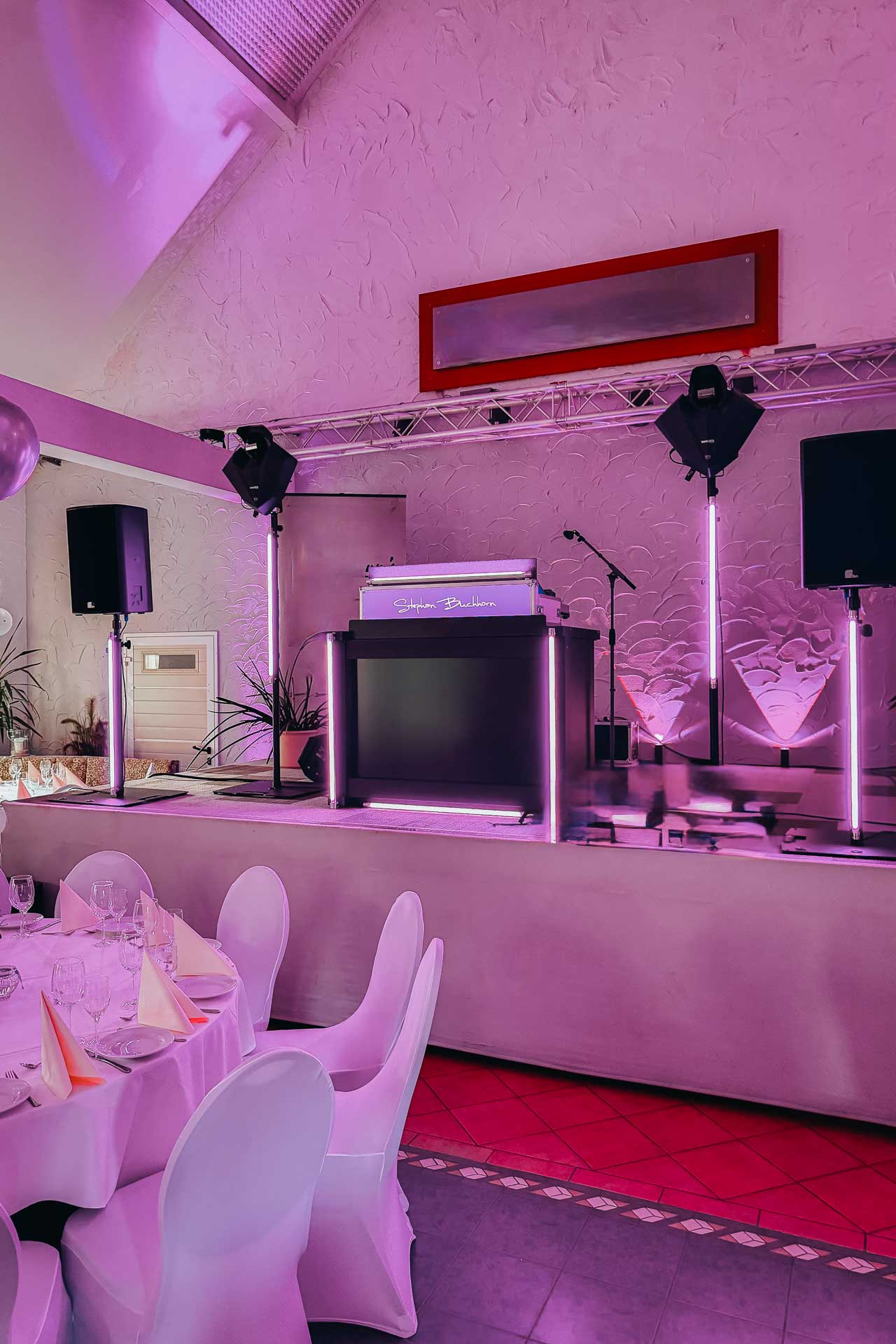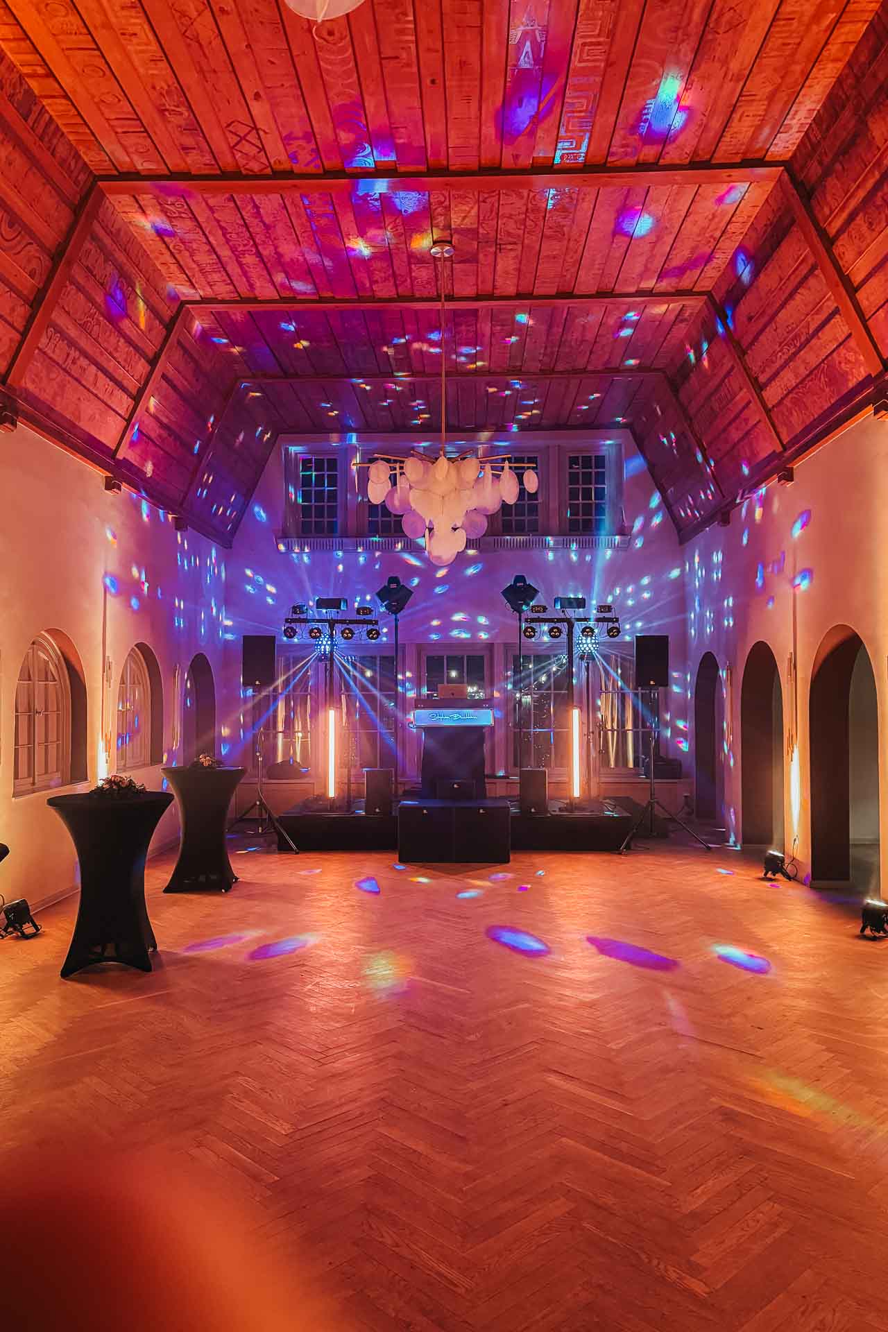 Im Festsaal erwartet euch mein großes Set. Mit einer umfassenden Ambiente-Beleuchtung tauche ich den Raum in eure Farben. Ich moderiere eure Programmpunkte souverän an und halte im Hintergrund die Fäden zusammen, damit ihr euch um nichts kümmern müsst.