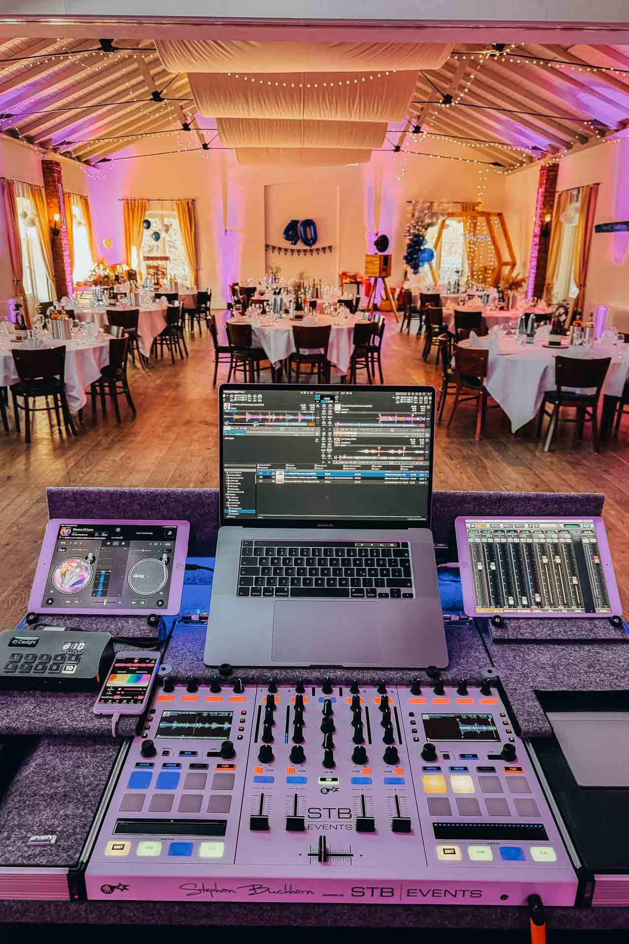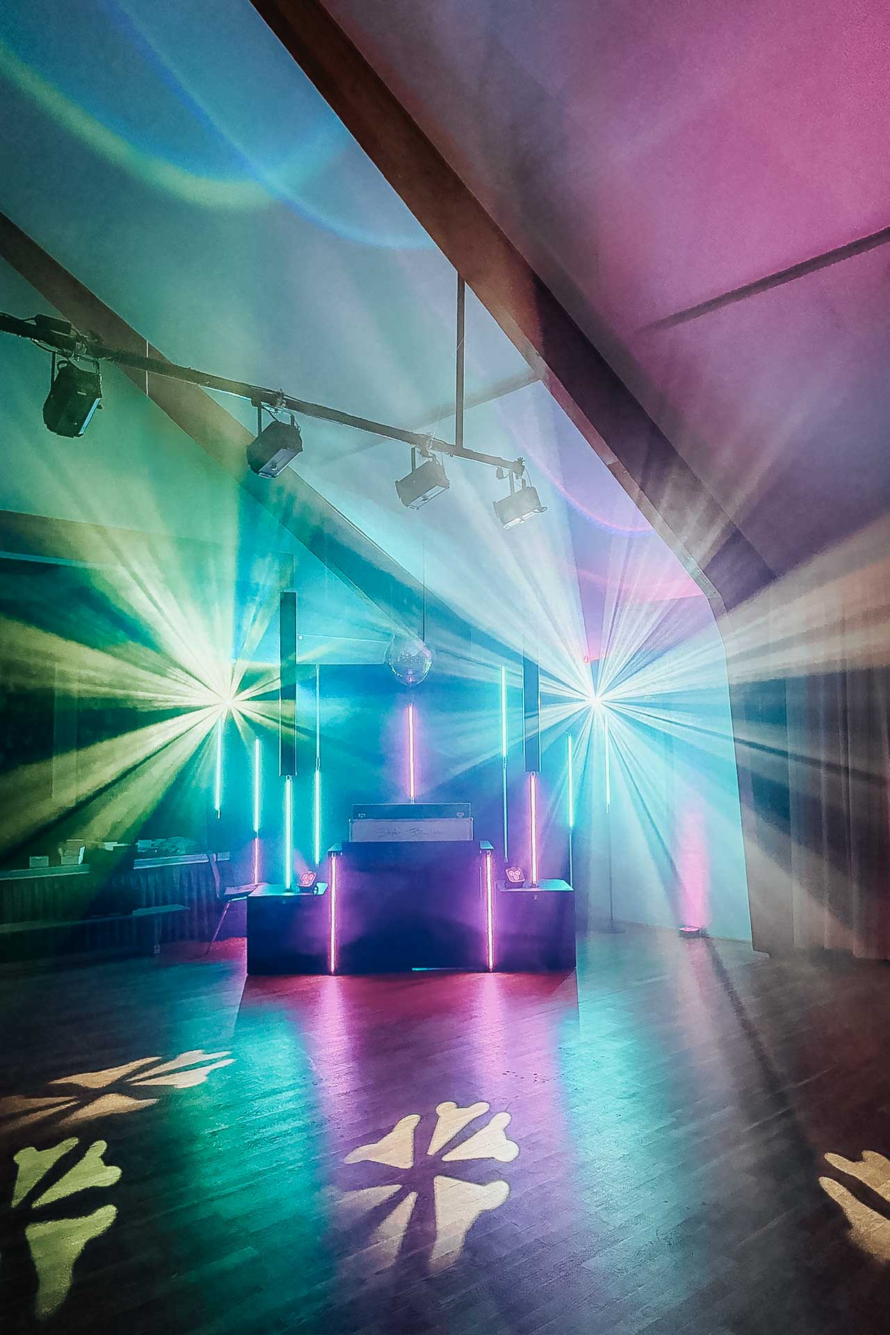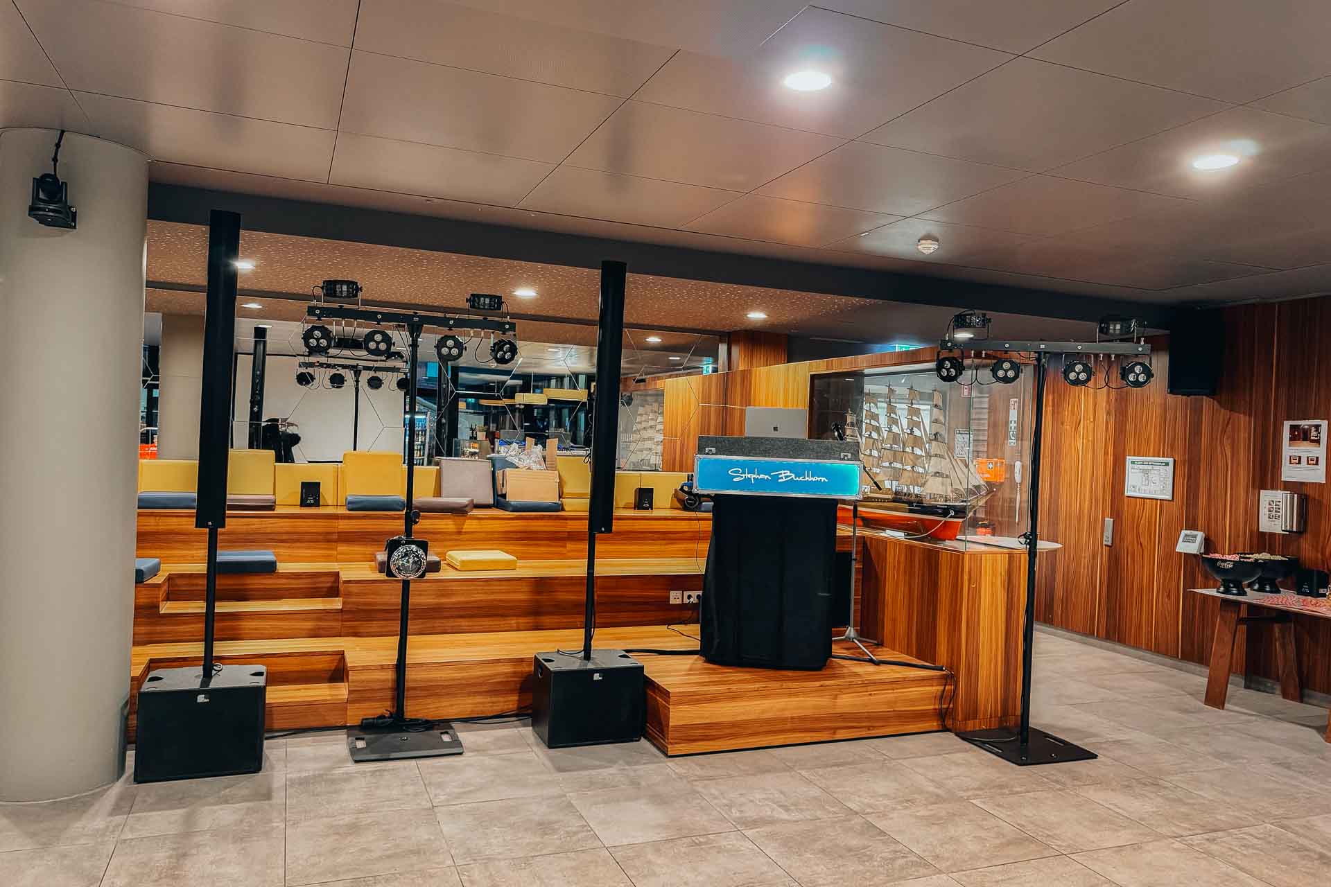 Im Festsaal erwartet euch mein großes Set. Mit einer umfassenden Ambiente-Beleuchtung tauche ich den Raum in eure Farben. Ich moderiere eure Programmpunkte souverän an und halte im Hintergrund die Fäden zusammen, damit ihr euch um nichts kümmern müsst.